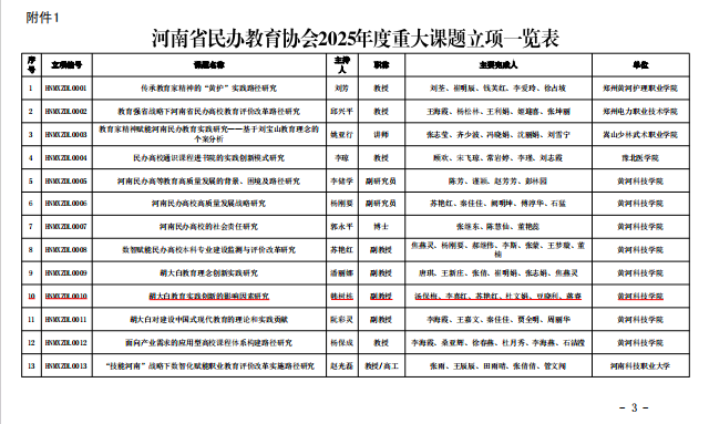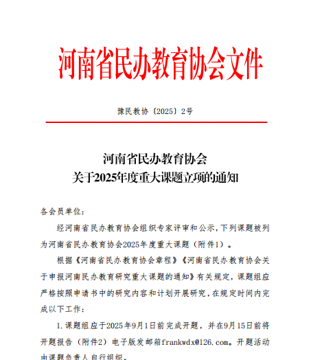 7月2日,河南省民办教育协会下发《关于2025年度重大课题立项的通知》,经河南省民办教育协会组织专家评审和公示,伟德bv1946官网分党委副书记、工会主席韩树栋主持申报的《胡大白教育实践创新的影响因素研究》被列为河南省民办教育协会2025年度重大课题。